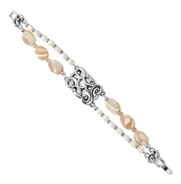 Barbados Nuvola Shell Bracelet Airy silver swirls tiny silver beads and Mother of Pearl flat and round beads combine for romantic effect. This delicate bracelet echoes the feel of the islands. Style: #JF7513 Collection: Barbados Color: Silver-Pearl Closure: Fold over clasp Length: 7 Material: Beads Finish: Silver plated Features: Mother Of Pearl
